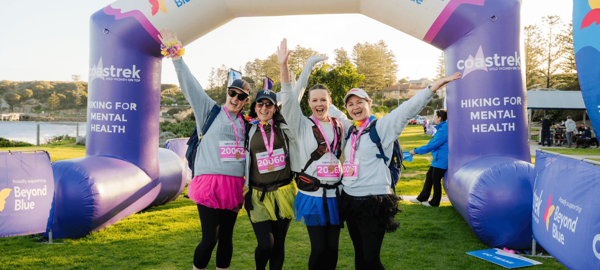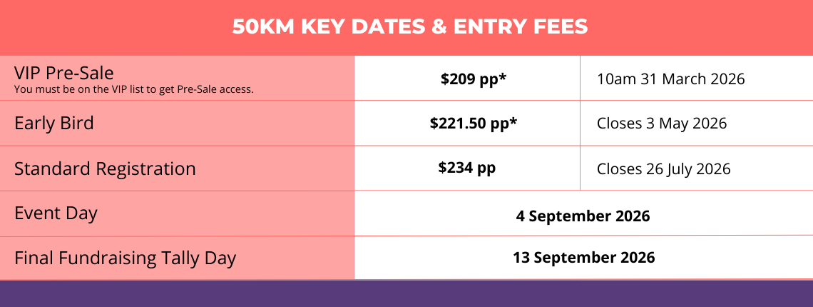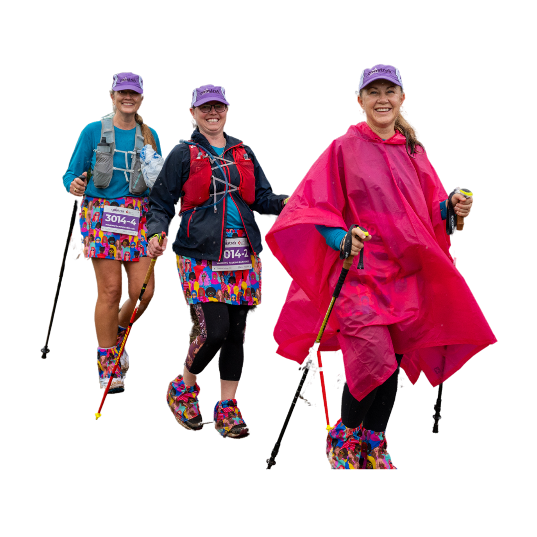 An epic journey including a customised Coastrek training program, Top Tips nights, plan + prep resources, fundraising support and access to our event-specific Facebook group. On Event Day you’ll also get a super supported adventure with Luv Stops, water, first aid and other services to refresh you, as well as medals and WOOHOO at the Finish Line!