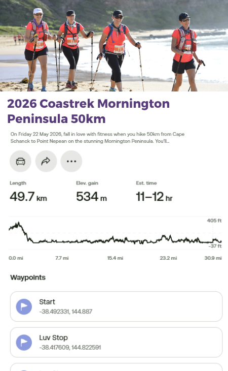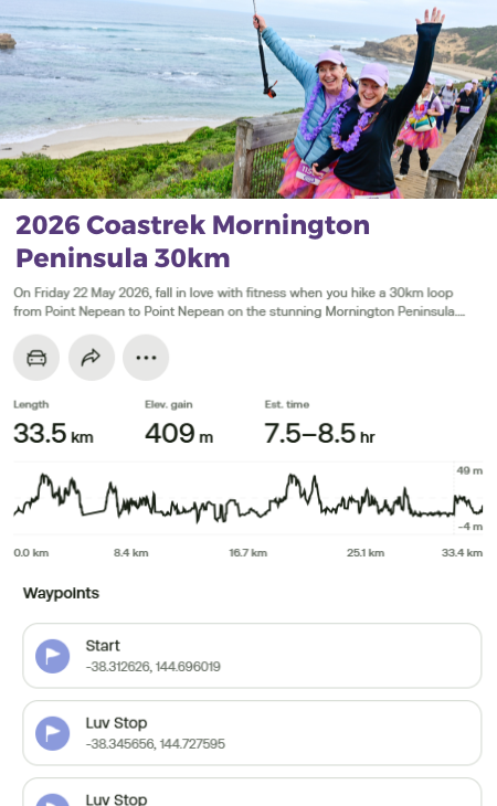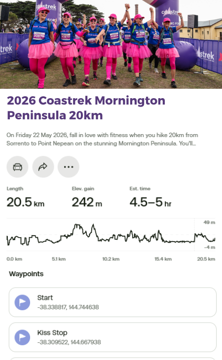 You can access the new Coastrek Mornington Peninsula 2026 route on your phone via the AllTrails App! First download the AllTrails App onto your phone via the App Store or Google Play, then click on the relevant Map links below to access the Coastrek route within the AllTrails App. The AllTrails App is FREE so you don't need to pay for it to access the map, just save it as a favourite :) But if you choose to get an AllTrails+ subscription, Coastrekkers get a one month free trial - see Goodie Bag in your Dashboard once you've signed up. With an AllTrails+ subscription, you can download the Coastrek route map and training trails for offline use (recommended!).